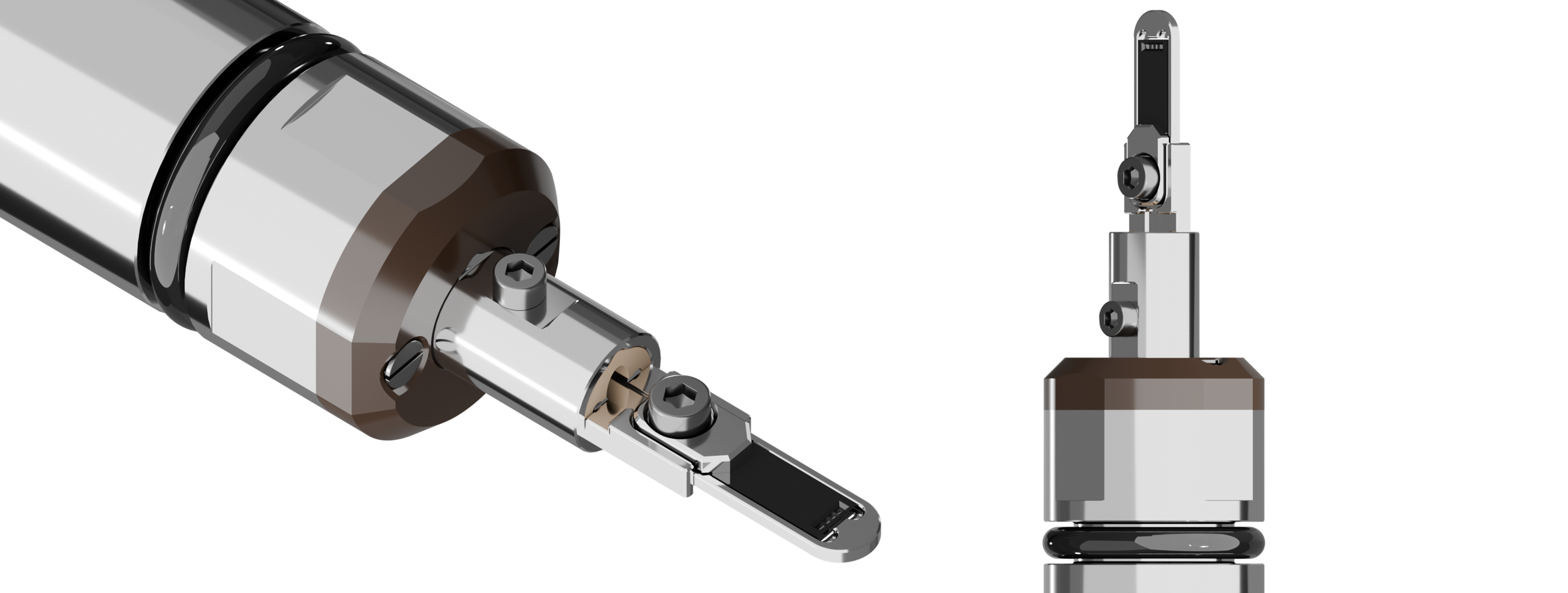 The novelty of the holder lies in making a long, thin chip, which can be clamped at its base and extend in through the pole piece without any lid or screws surrounding the chip in the imaging area. This allows to insert about a ~800 µm thick and 4 mm wide piece in between the TEM pole piece thus allowing for max tilt range in most TEMs without any chance of collision.